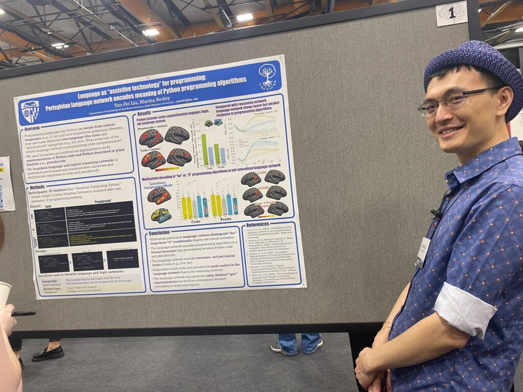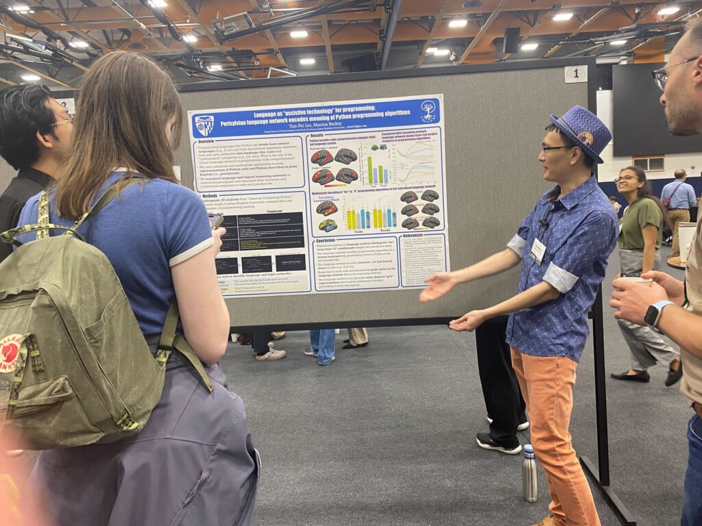 The work I presented asked a deceptively simple question: what role does the brain’s language network play in computer programming? We know programming mostly recruits the brain’s reasoning networks, but our data suggest that the language system lends support, it’s almost like an “assistive technology.” In our study, students who had just finished their first semester of Python read either short programs or equivalent pseudocode while in the MRI scanner. Although the language regions were not strongly active overall, their responses were early and allowed us to reliably tell apart “for” loops from “if” conditionals in language-selective cortex, regardless of whether they were expressed in code or plain English.